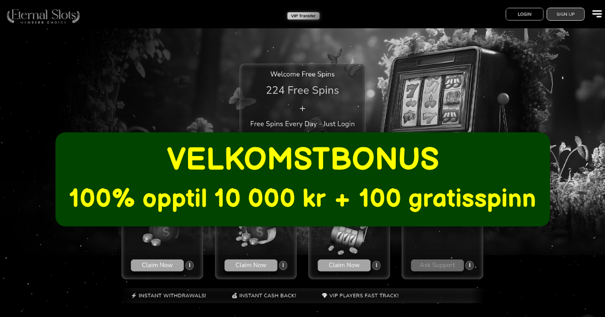 Eternal Slots Casino ønsker norske spillere velkommen til en verden av spenning og gevinster. Start reisen din med en generøs velkomstbonus på 100% opptil 2000 kr, som kommer med et rimelig omsetningskrav på 35x for å sikre rettferdig spill. Som et lisensiert casino under Malta Gaming Authority, tilbyr vi trygge og pålitelige opplevelser for alle i Norge. Nyt raske uttak som behandles innen 24 timer, samt 24/7 kundestøtte på norsk for å løse spørsmål raskt. Vårt utvalg inkluderer de beste spilleautomatene, klassiske bordspill og mye mer fra topp leverandører som NetEnt, Pragmatic Play og Microgaming. Enten du foretrekker actionfylte slots eller strategiske spill, finner du tusenvis av alternativer optimalisert for underholdning. Med vår mobil casino bonus kan du spille sømløst på telefon eller nettbrett, uansett hvor du er i Norge. Innskudd er enkle med populære metoder som Visa, Mastercard, Skrill og Trustly, mens uttak skjer raskt og sikkert til din bankkonto. Som et rask utbetaling casino prioriterer vi din tilfredshet, så bli med i dag og opplev hvorfor Eternal Slots Casino er det ultimate valget for norske spillentusiaster. Vi fokuserer på ansvarlig spilling og sikrer at alle opplevelser er positive og minneverdige.